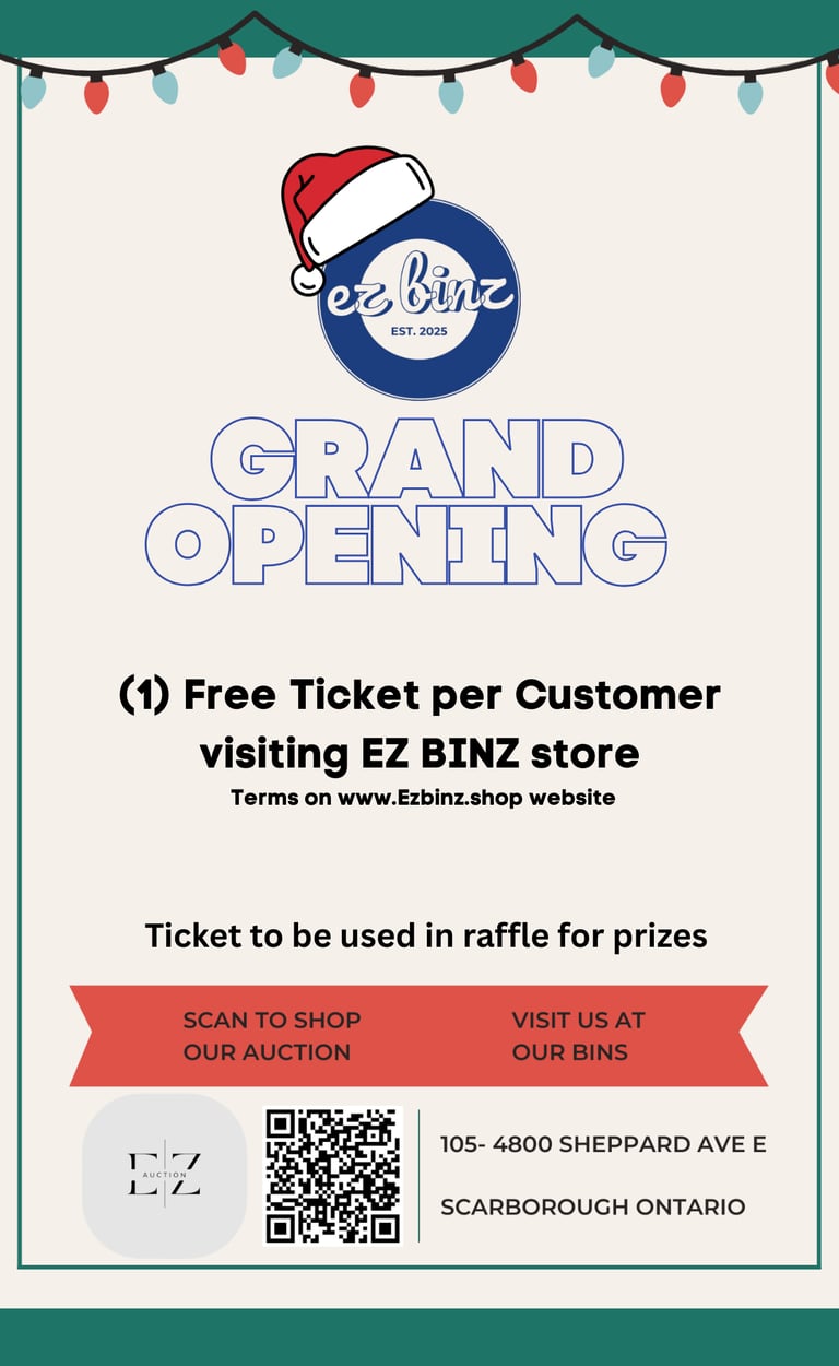 This is a store opening promotional event and is in no way related or assumed to gambling. There is no purchasing of or additional tickets. Visiting physical store "EZ BINZ" entitles you to (1) Free Ticket / Customer. Every $15 spent on goods, will automatically enter you additionally into the prize contest. No tickets will be sold for monetary value. All tickets are simply tickets and will not be tradeable/exchangeable/redeemable other than the two prize winners.
